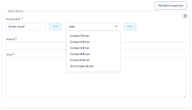 Variables are accessed via the Variable Inspector and/or via Select attribute pickers inside recipient fields.