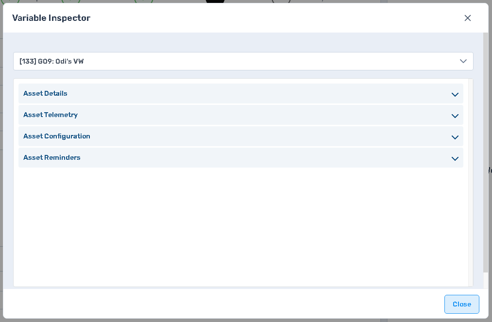 Asset records should contain the information you intend to use (e.g., contacts, asset identifiers). If a field is not populated, it may appear as NA in Variable Inspector and may resolve as blank when the workflow fires.