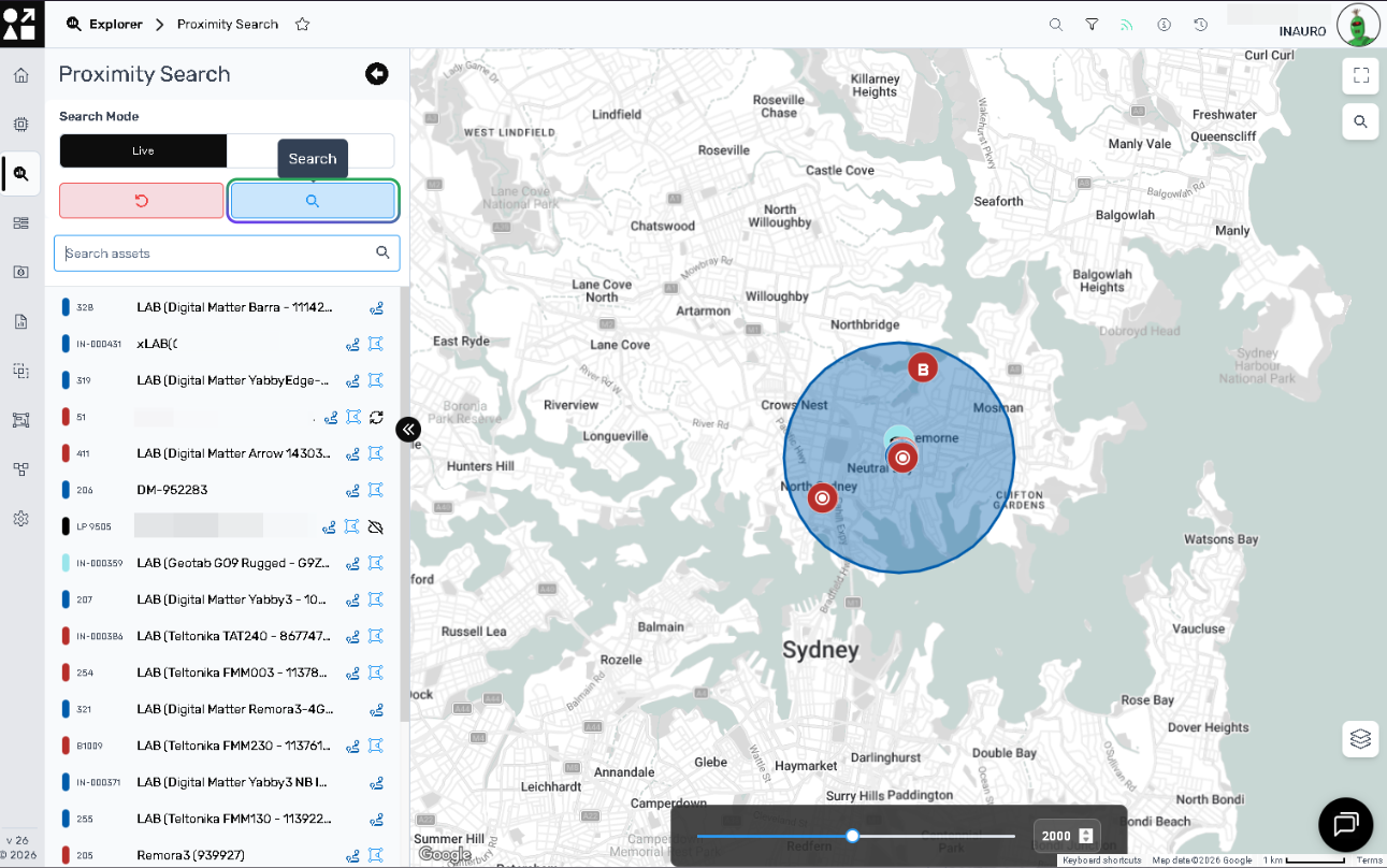 Proximity Search helps you find assets near a point of interest (POI) using location data reported by devices connected to those assets. It is designed for operational decisions (who is closest right now) and investigations (who was near a location during a specific time window).