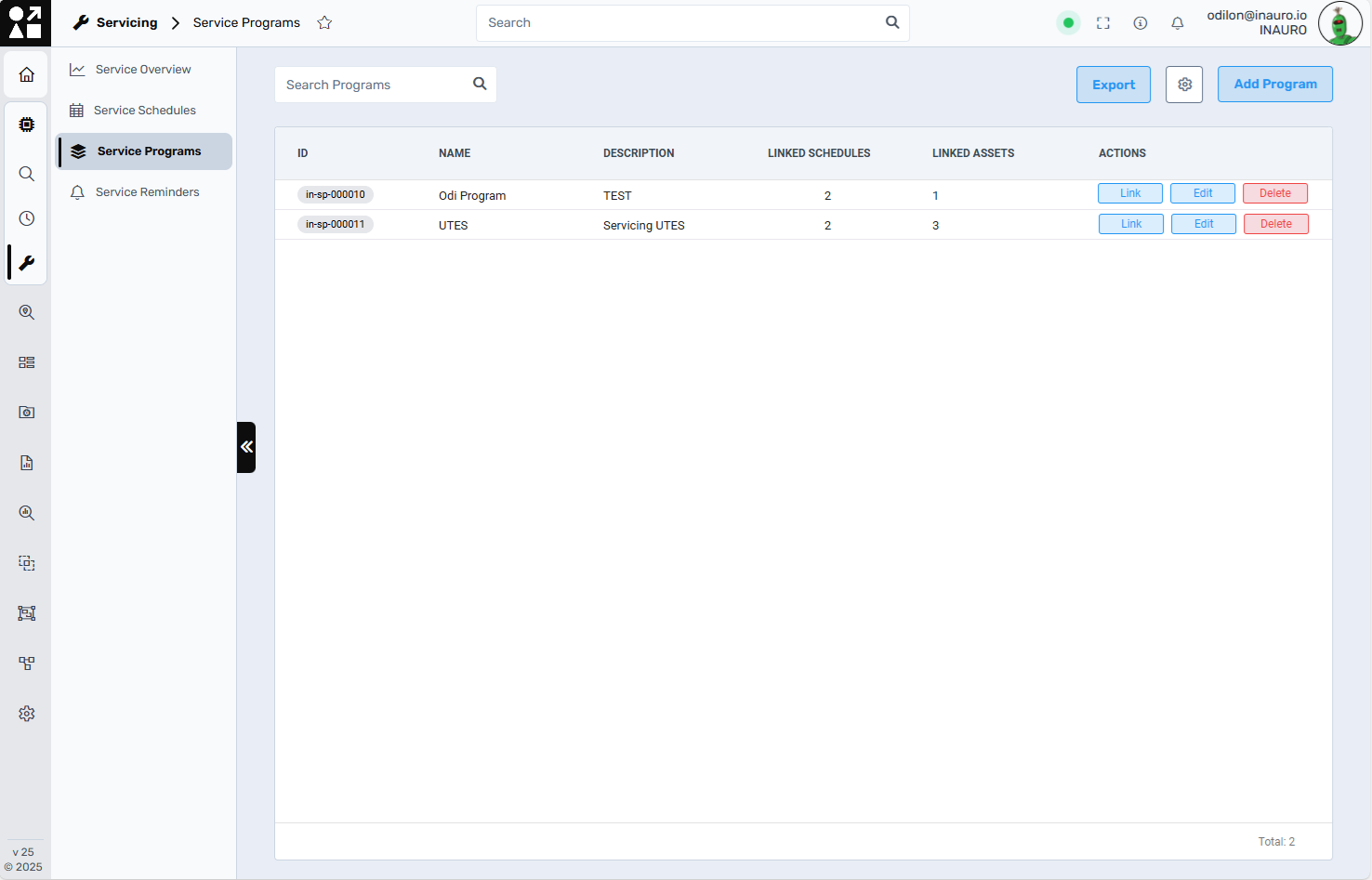 Delete: Use the red Delete button to permanently remove a service program. Deleting a program will not delete its associated schedules but will unlink all assets.